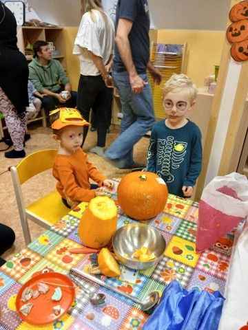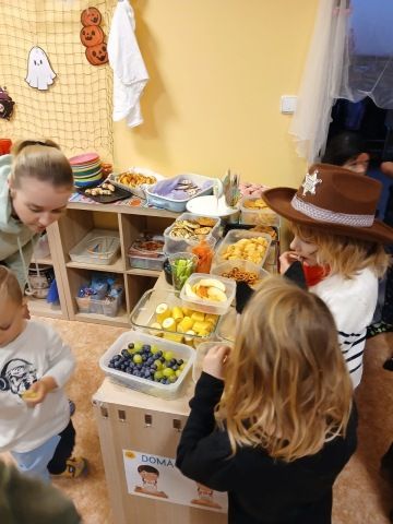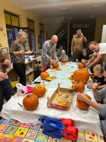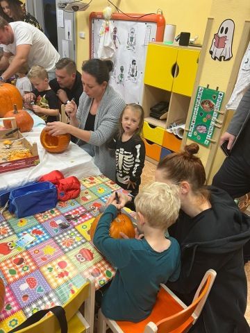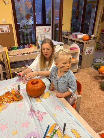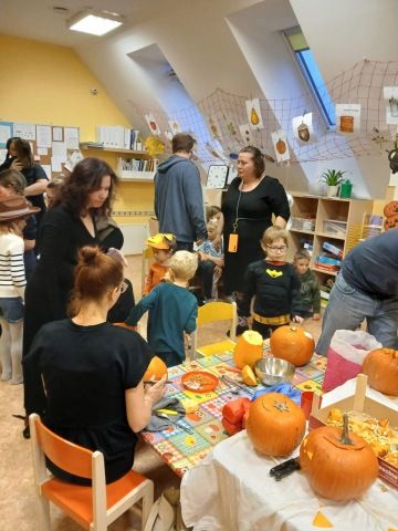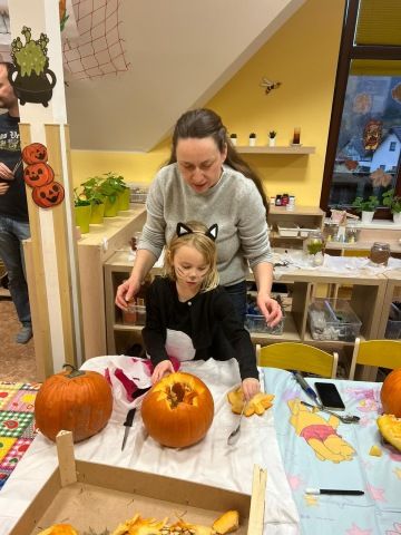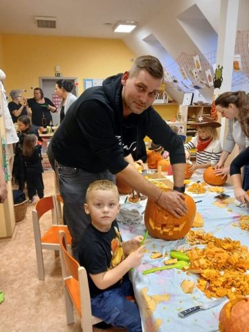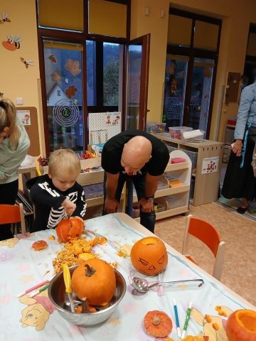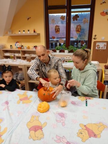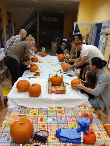 Děti se oblékly do halloweenských masek a rodiče přinesli dýně na dlabání a občerstvení. Povídali jsme si, tančili, zpívali a strašili.