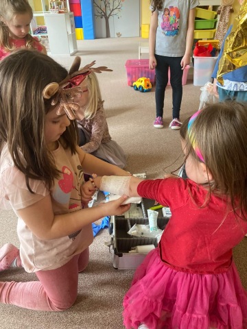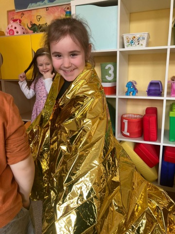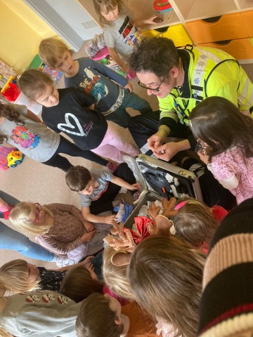 Do školky k nám přišel také tatínek Charlottky ze třídy Koťátka, který pracuje u záchranné služby a seznámil nás s 1. pomocí. Ukázal nám, jak můžeme být nápomocní při záchraně člověka a jak správně zavolat pomoc.